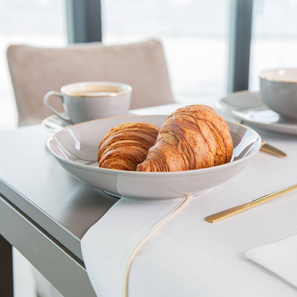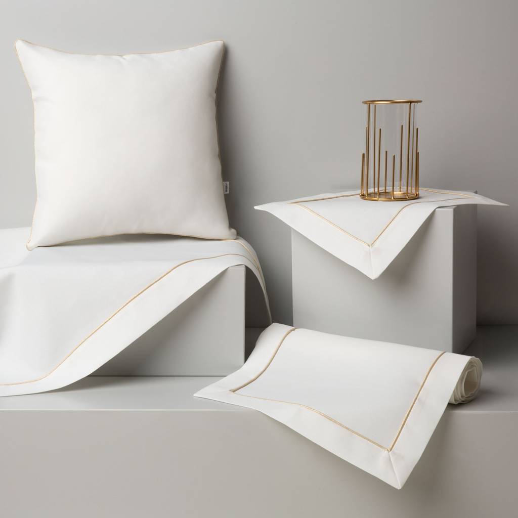 Obrus Gold Line je dekoratívny prvok aranžovania stola, ktorý spája svetlú tkaninu so subtílnym zlatým akcentom. Biely povrch materiálu rozjasňuje priestor a vytvára estetické pozadie pre stolový riad a dekorácie. Jemné zlaté lemovanie prebiehajúce pozdĺž okrajov zdôrazňuje formu obrusu a dodáva mu výrazný charakter.